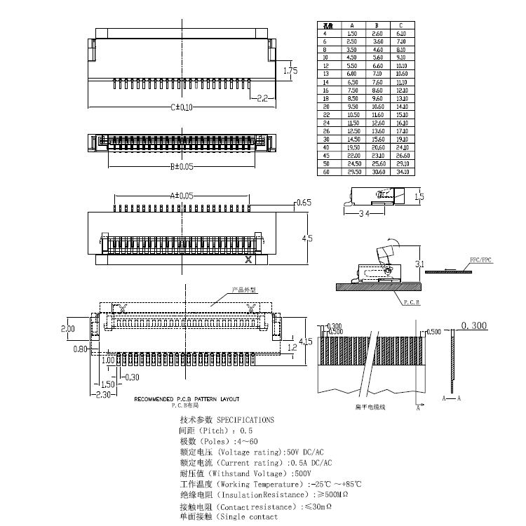 0.5pitch 上翻下接SMT單面接觸H=1.5mm