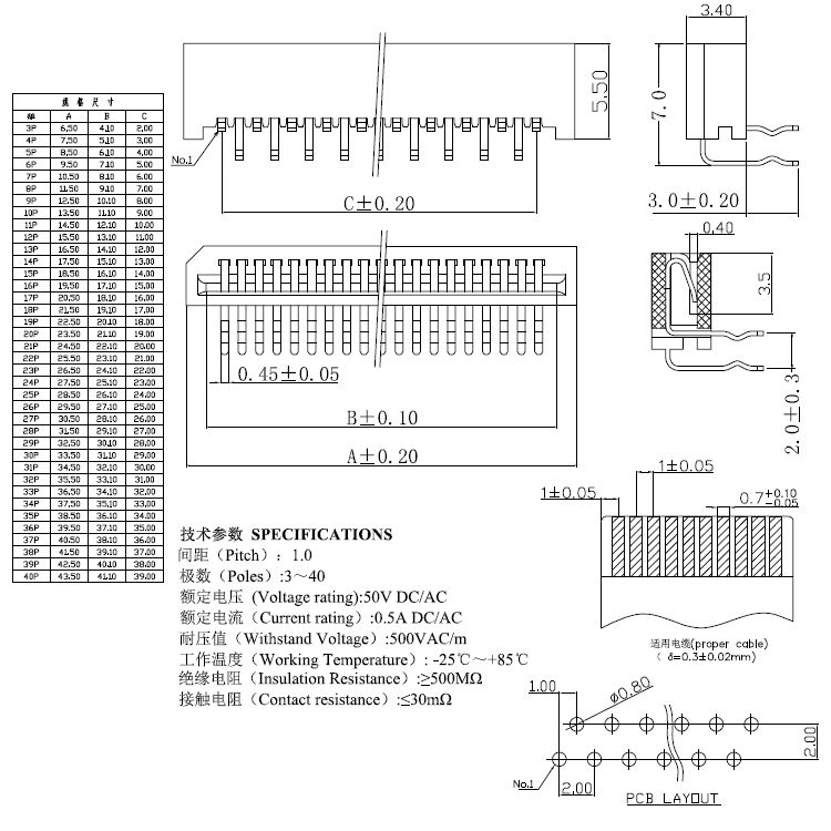 1.0pitch 雙排正腳臥插單面接觸H=3.4
