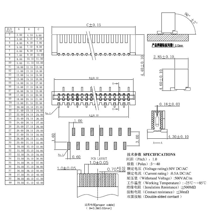 1.0pitch 雙排正腳立貼雙面接觸H=2.85