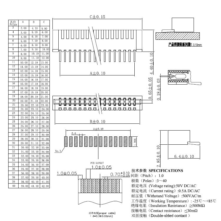 1.0pitch 單排臥貼雙面接觸H=2.854