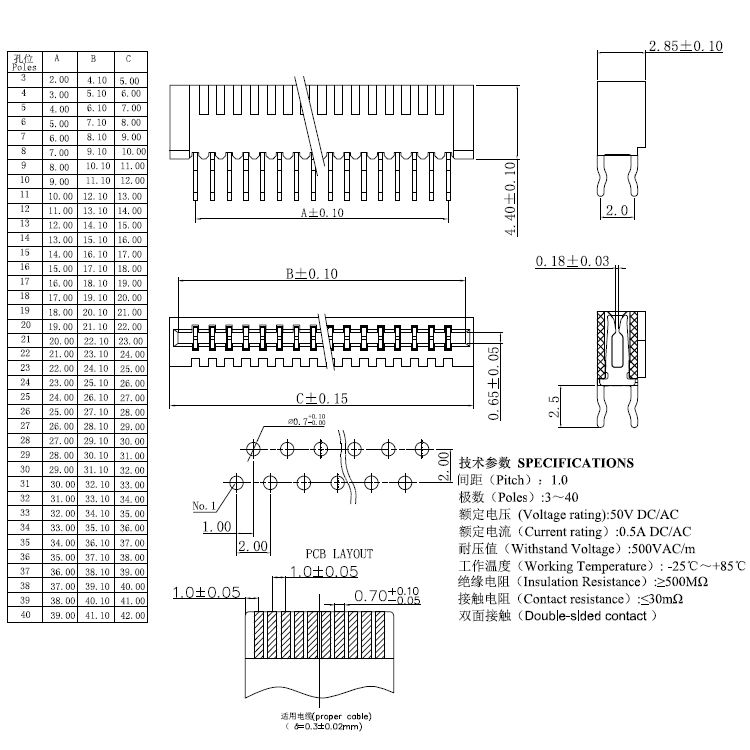 1.0pitch 雙排正腳立插雙面接觸H=2.85