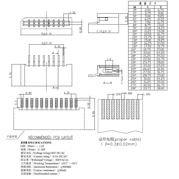 1.25pitch 單排臥貼雙面接觸H=2.8