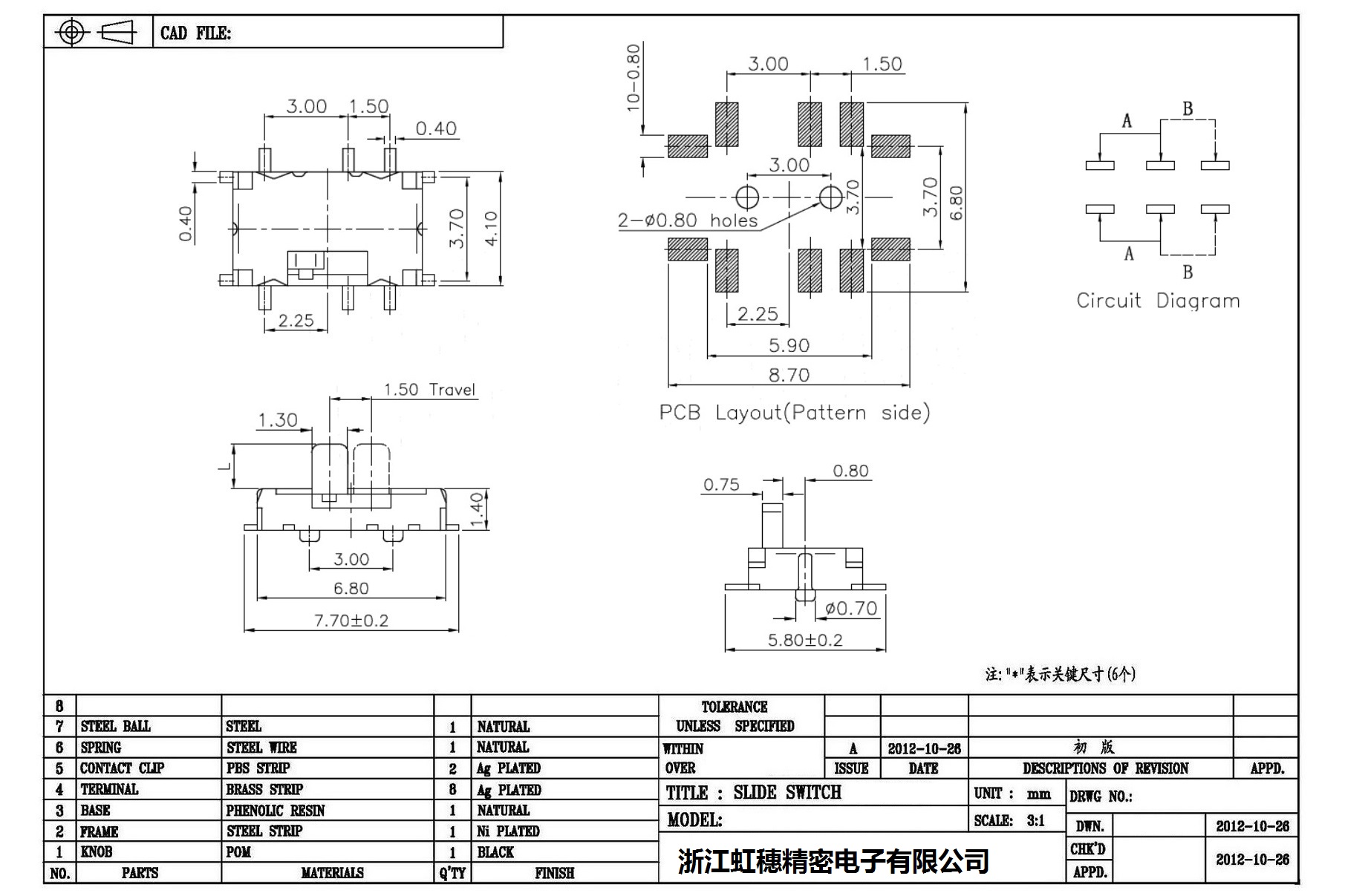 迷你撥動開關側撥 技術參數: