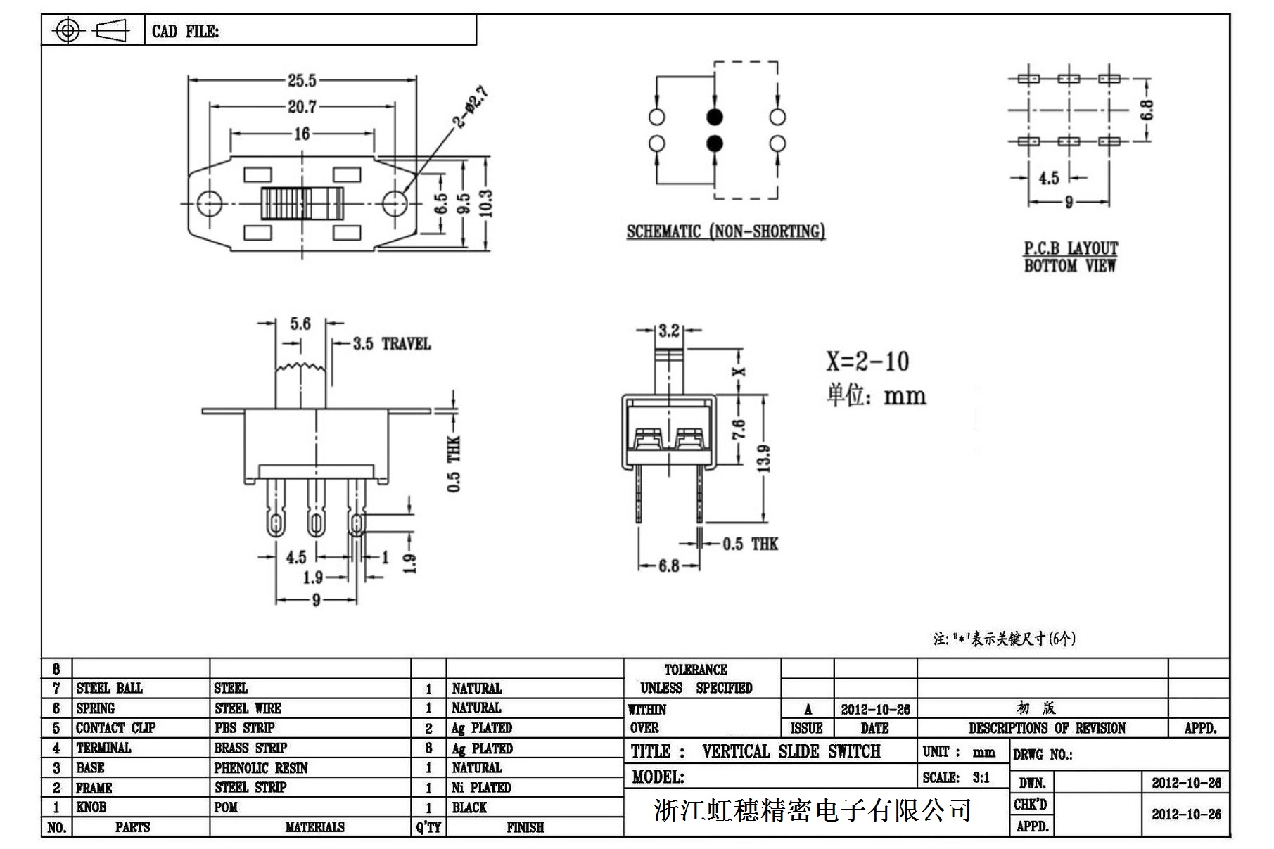 Verticaltoggle switch side dial/ Vertical slide switch technical indicators
