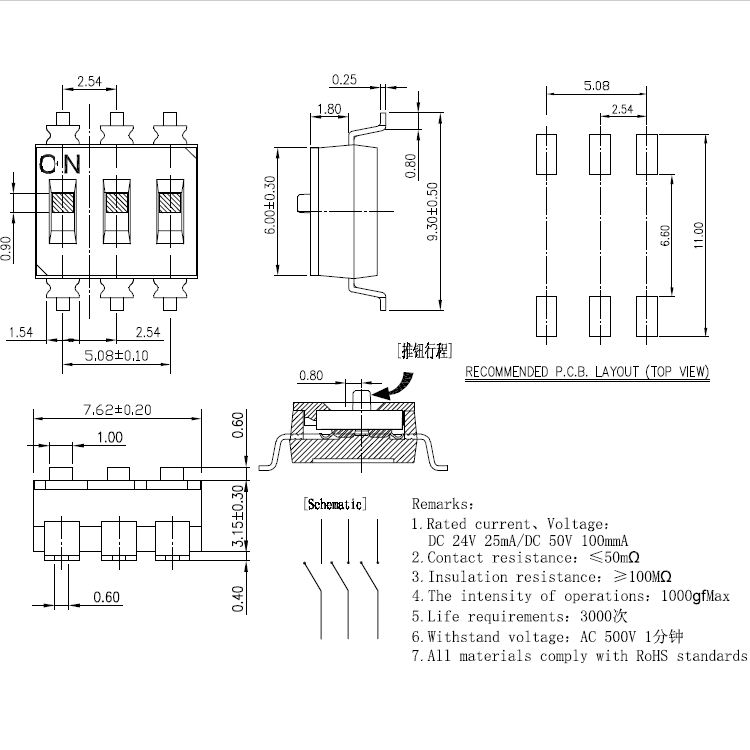 3. 絕緣電阻: 100MQ 4. 操作力: 1000gfMax