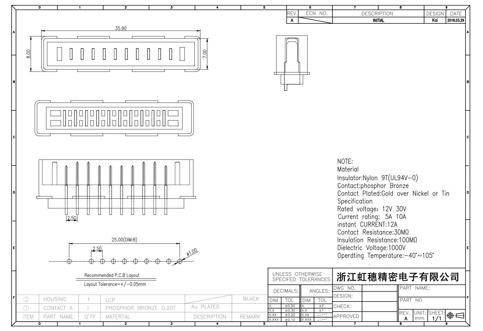 絕緣主體:Nylon 6T/9TUL94V-0
