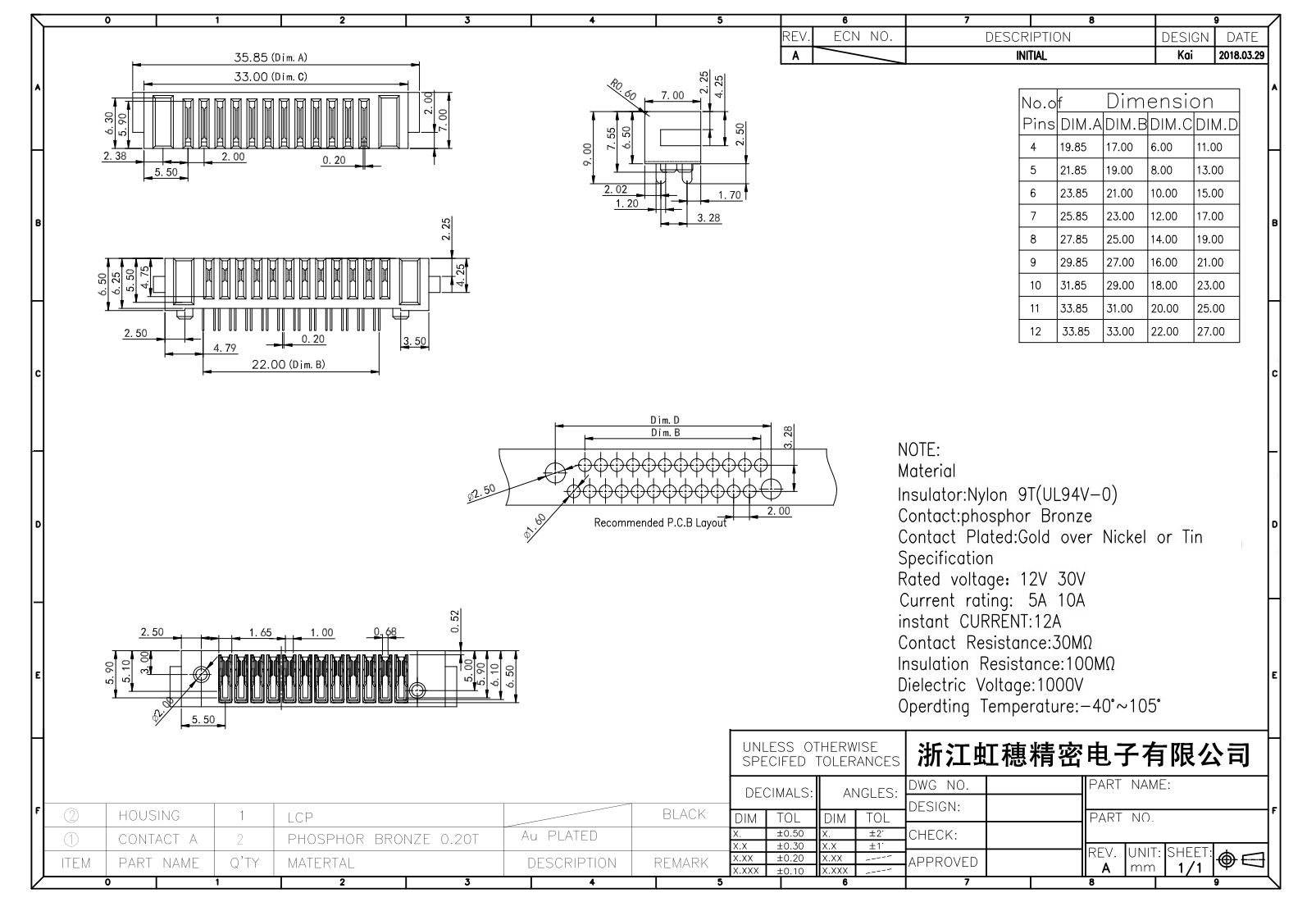 表面鍍層:金在鎳/錫之上,鍍層厚度3U