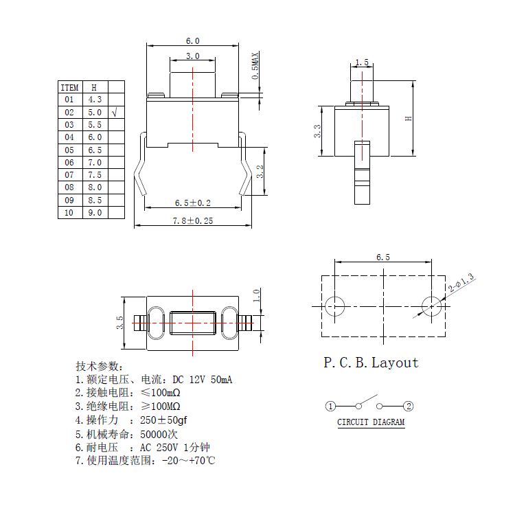 7. 使用濕度: ≤85% RH 8. 使用壽命: 50000次
