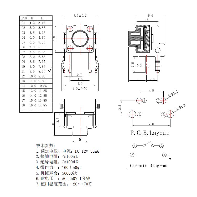 規格:6mm*6mm*9.5 ? ? ? ? ? ? ? ? ?力度:160士50gf