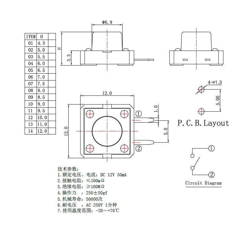 規格:12mm*12mm ? ? ? ? ? ? ? ? ?力度:250士50gf