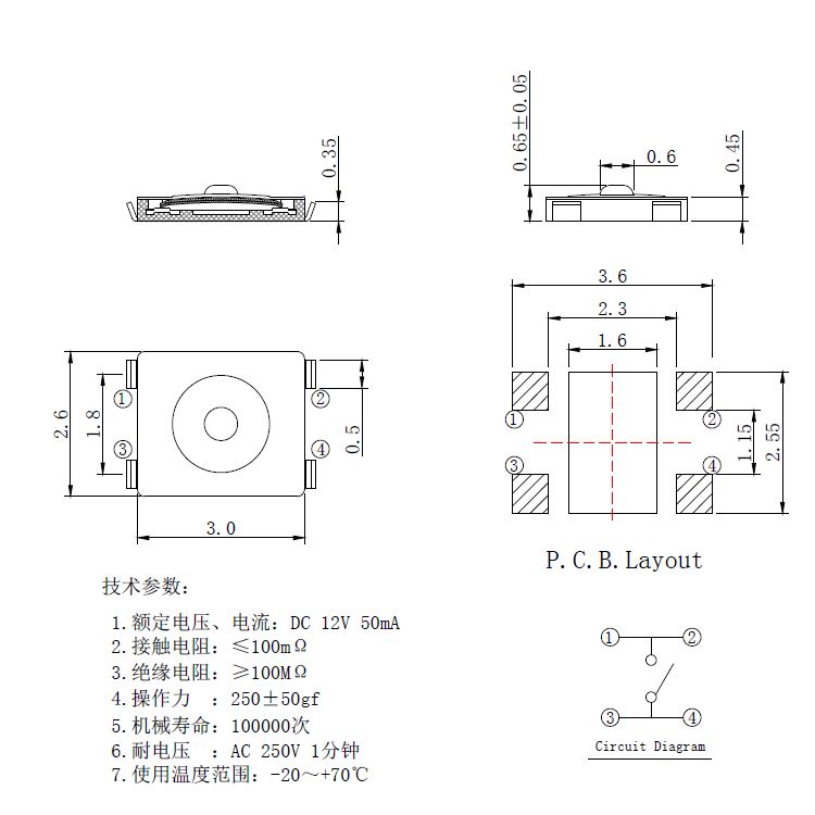 規(guī)格:2.6mm*3mm ? ? ? ? ? ? ? ? ?力度:250士50gf