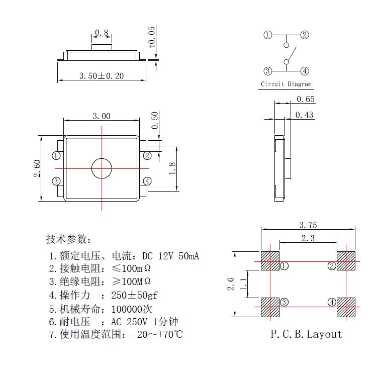 規(guī)格:2.6mm*3mm ? ? ? ? ? ? ? ? ?力度:250士50gf