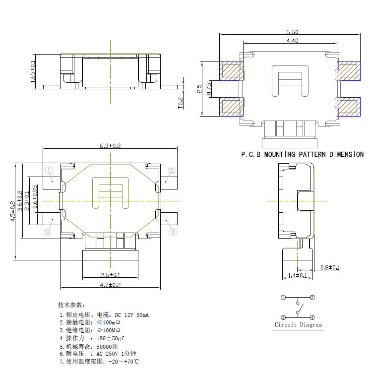 1. 額定電流、電壓: DC 12V 50mA 2. 接觸電阻: ≤100mΩMAX