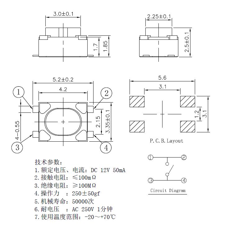 規(guī)格:3.2mm*4.2mm ? ? ? ? ? ? ? ? ?力度:250士50gf