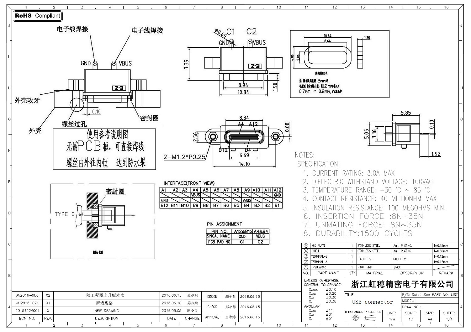 USB TypeC防水母座技術參數(shù):