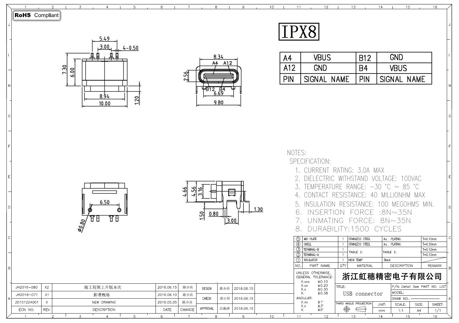 USB TypeC防水母座技術參數: