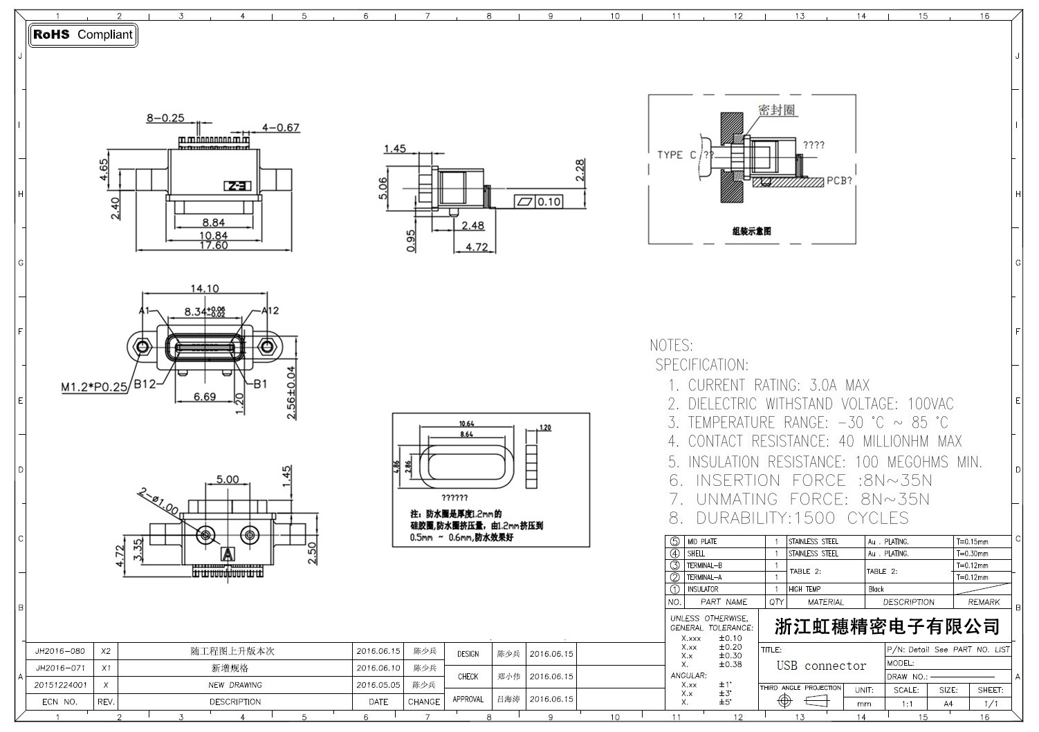 USB TypeC防水母座技術參數: