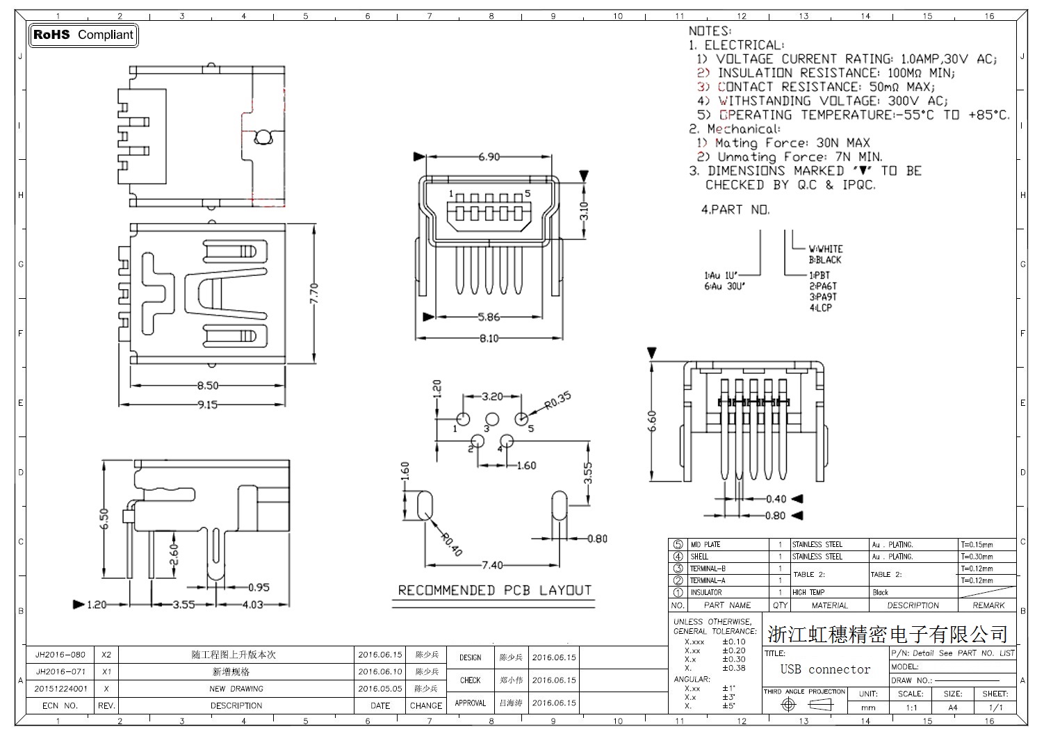 MINI USB插座技術參數(shù):