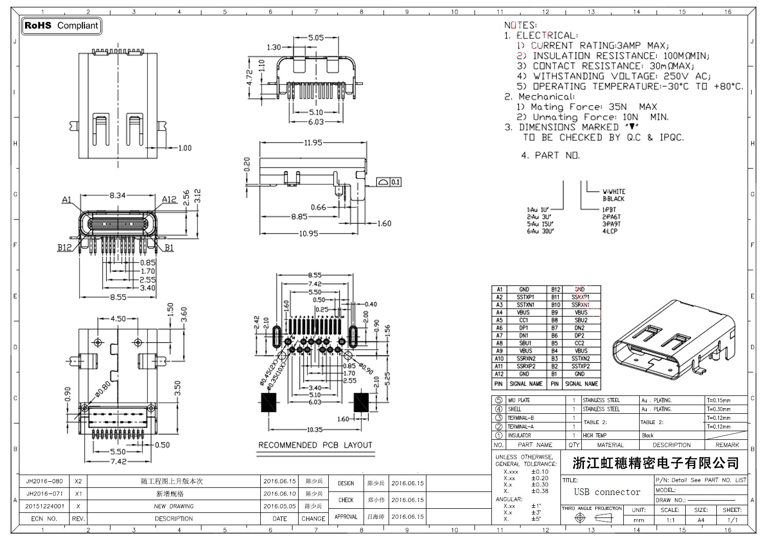USB Type C母座技術參數: