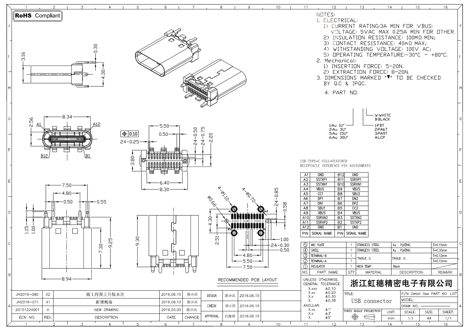 USB Type C母座技術參數: