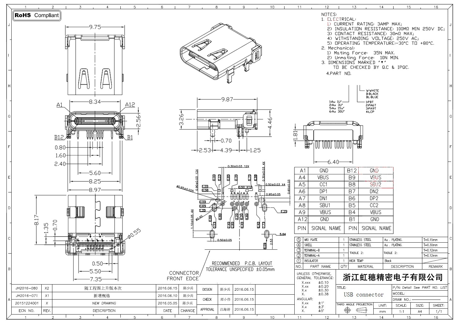 USB Type C母座技術參數: