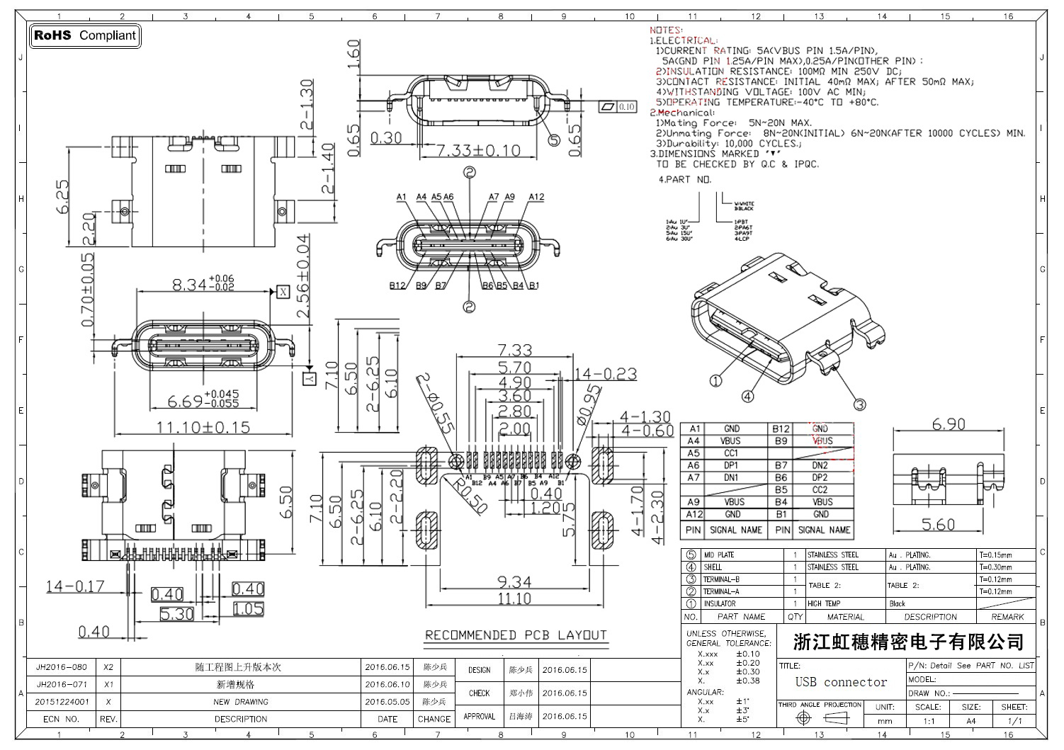 USB Type C母座技術參數: