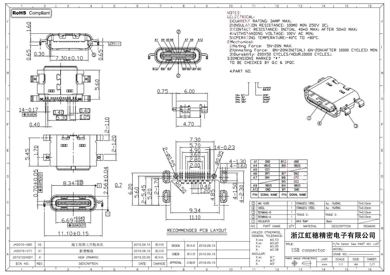 USB Type C母座技術參數: