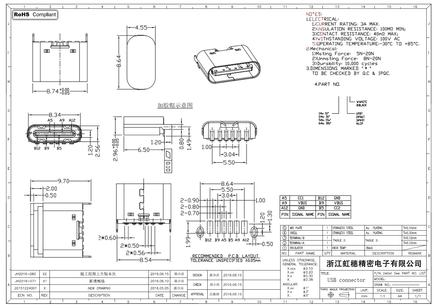 USB Type C母座技術參數:
