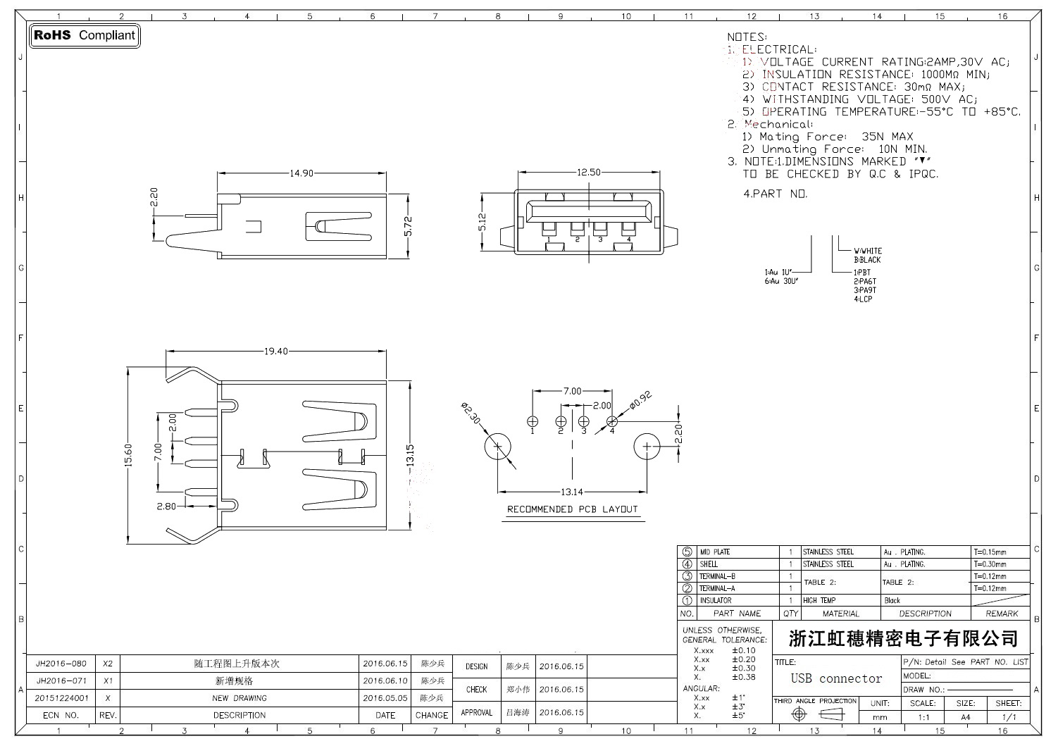 2.0USB插座技術參數: