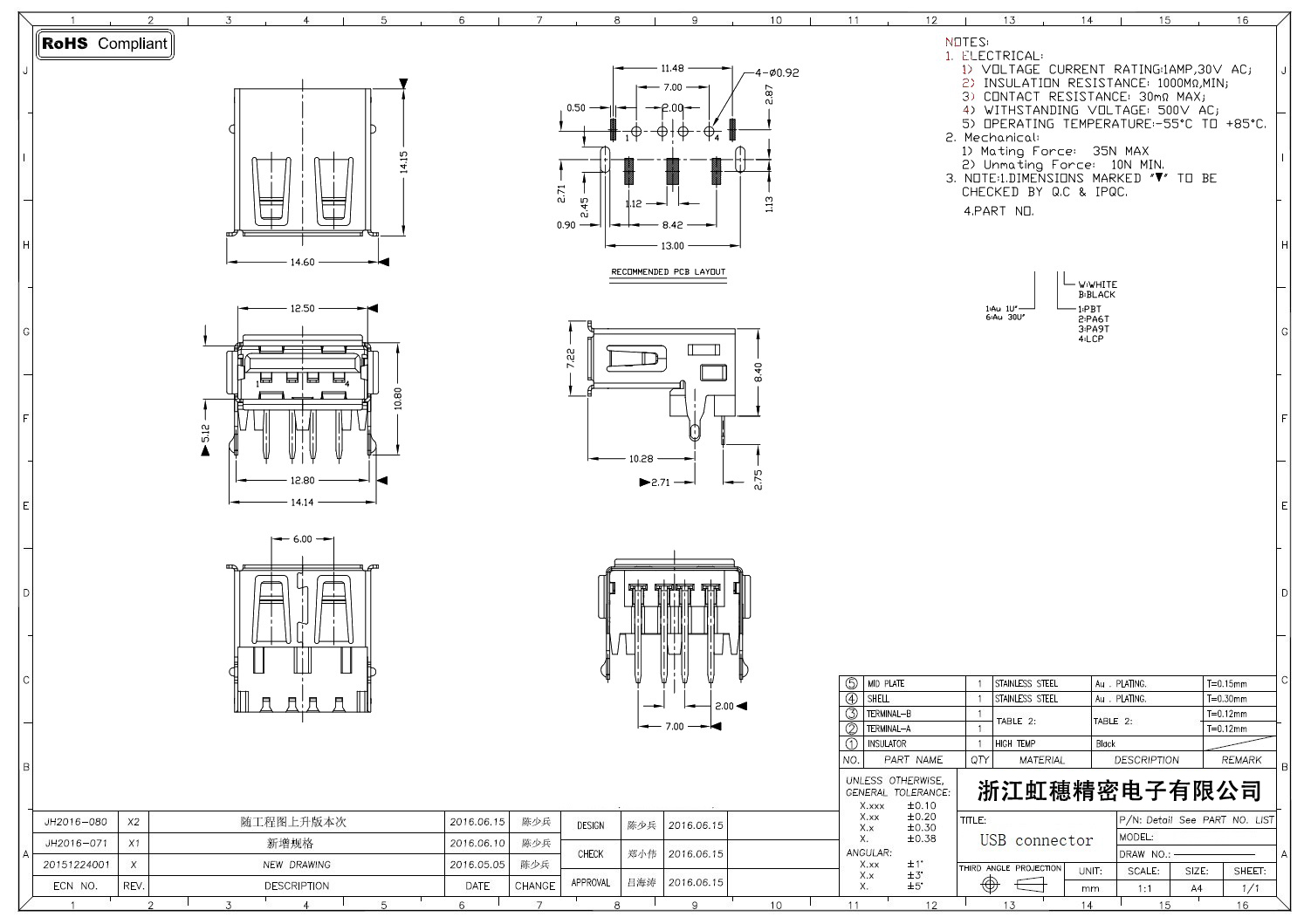 2.0USB插座技術參數: