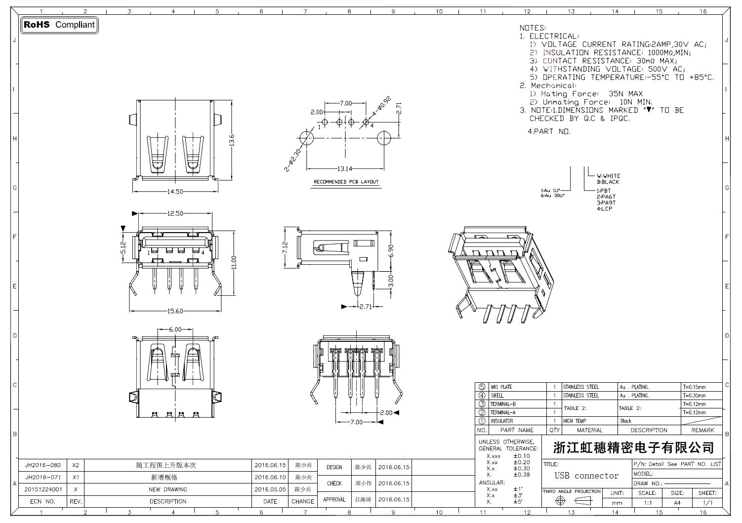 2.0USB插座技術參數: