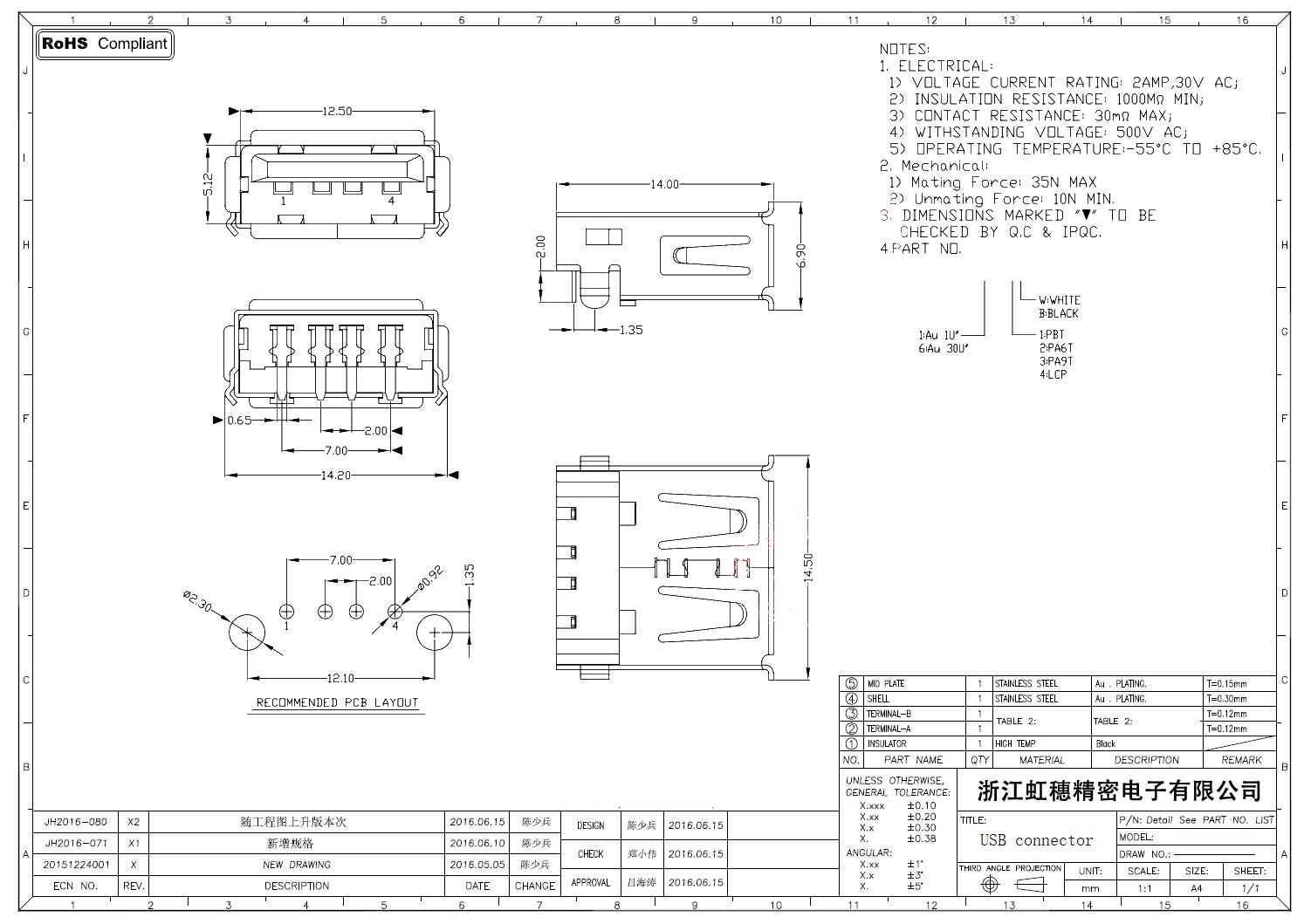 2.0USB插座技術參數: