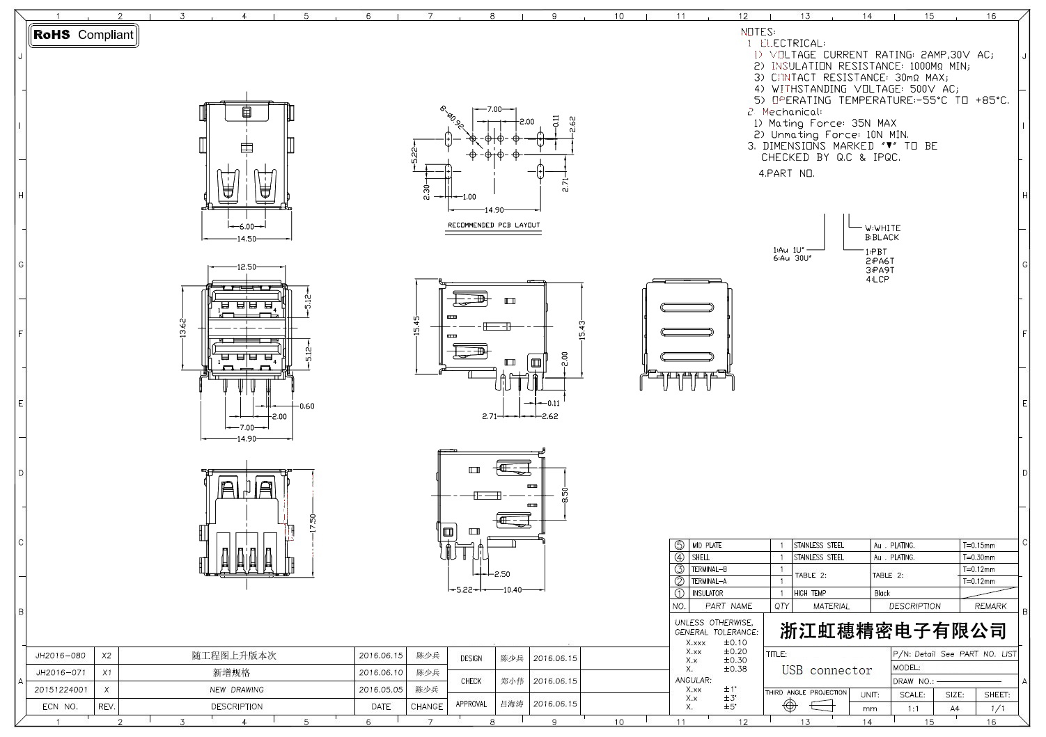 2.0USB插座技術參數: