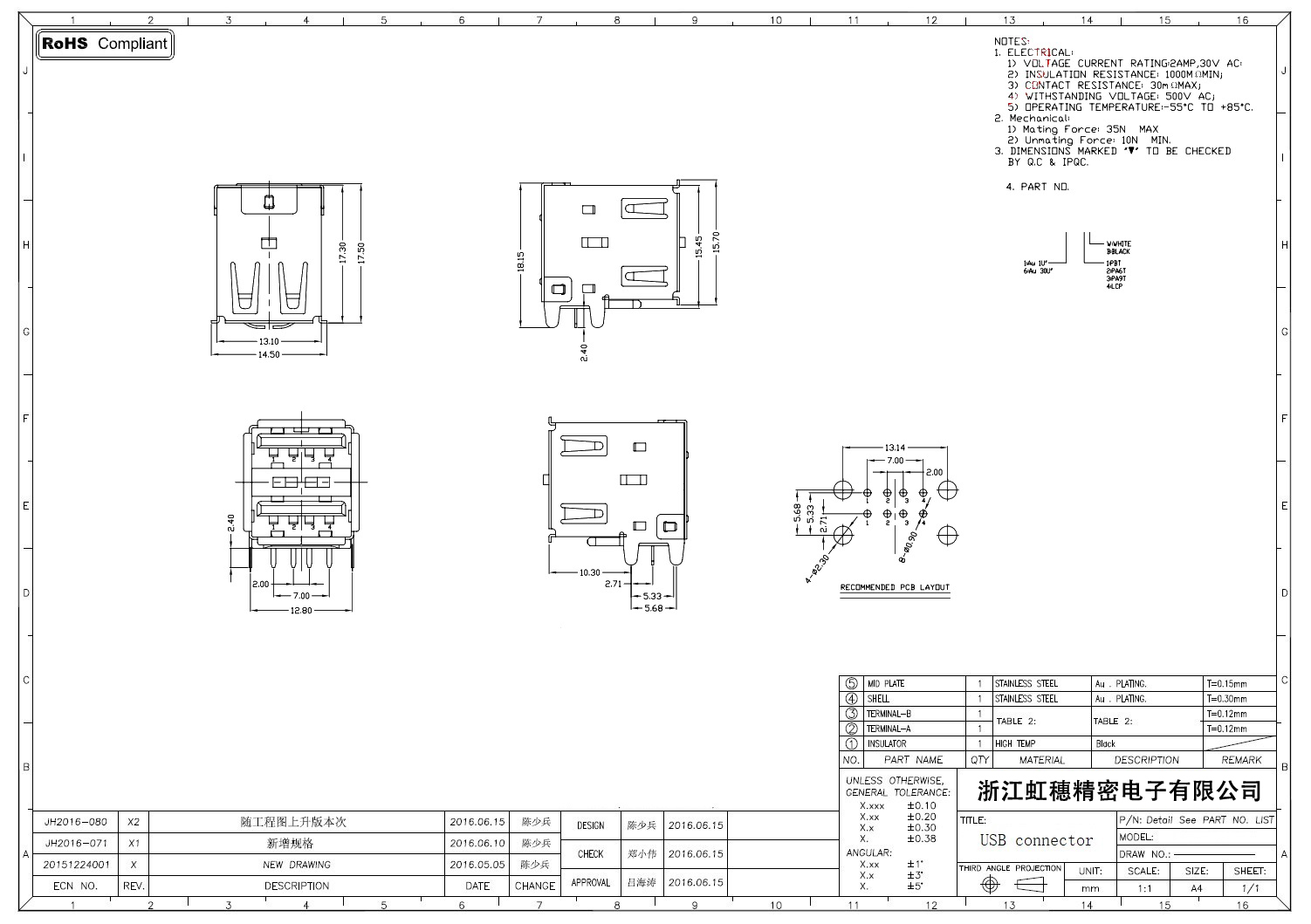 2.0USB插座技術參數:
