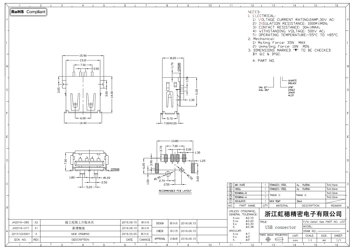 2.0USB插座技術參數: