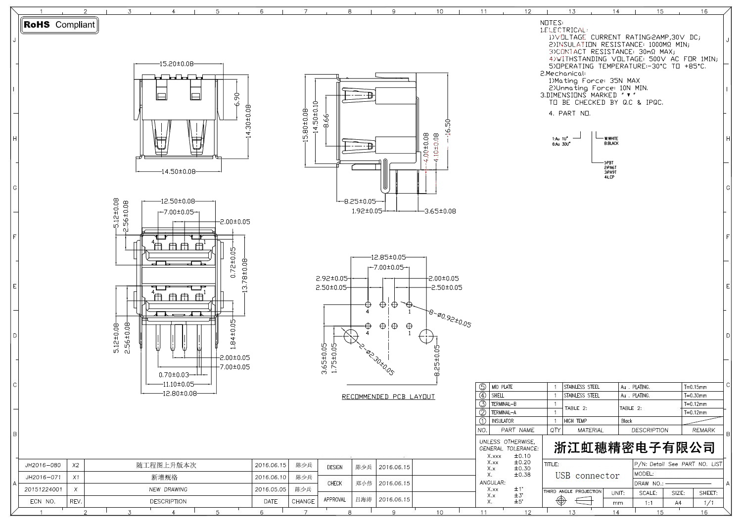 2.0USB插座技術參數: