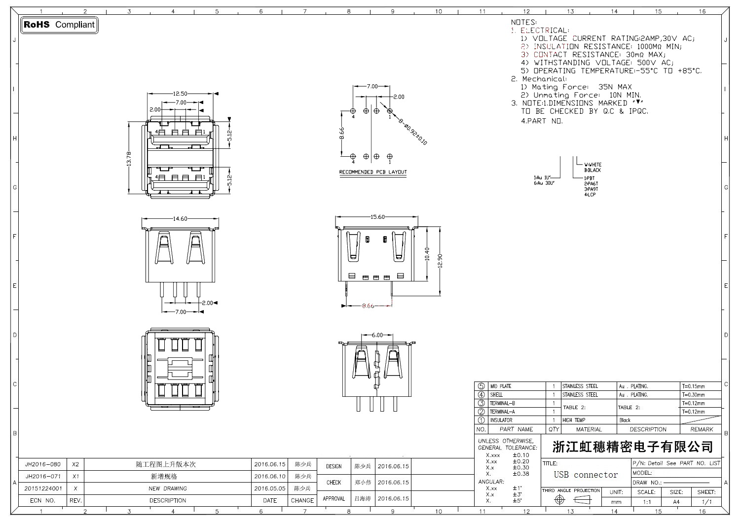 2.0USB插座技術參數: