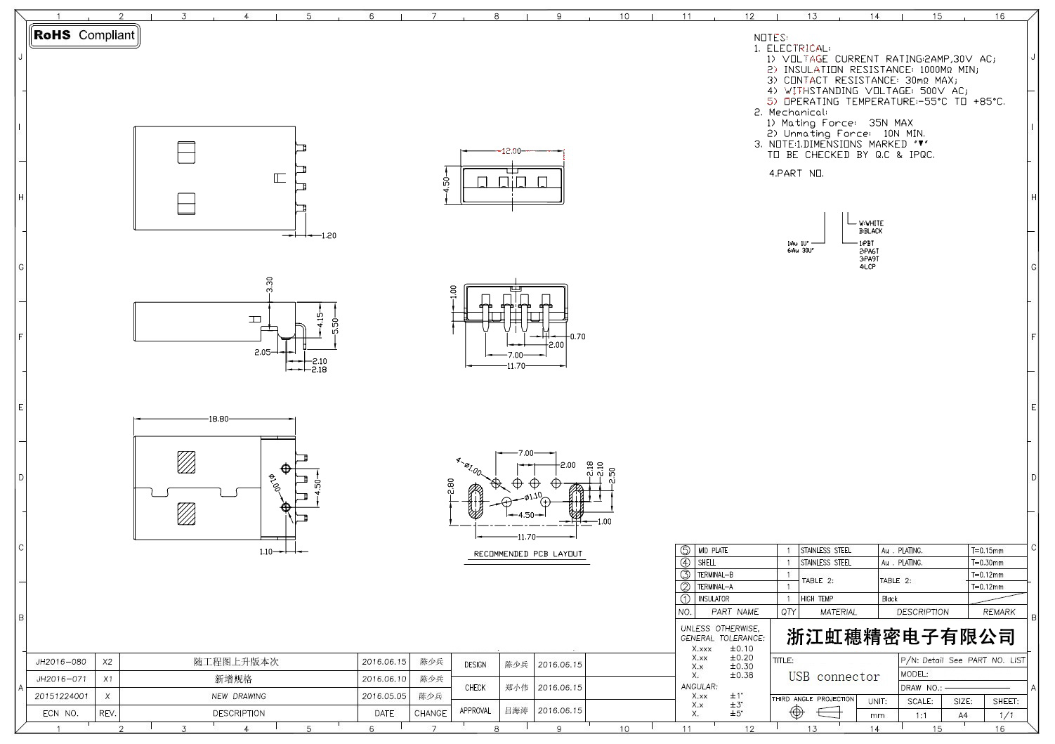 2.0USB插座技術參數: