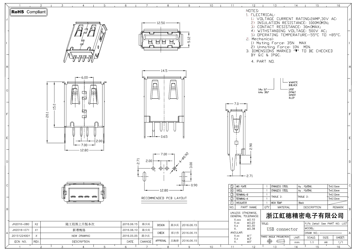 2.0USB插座技術參數: