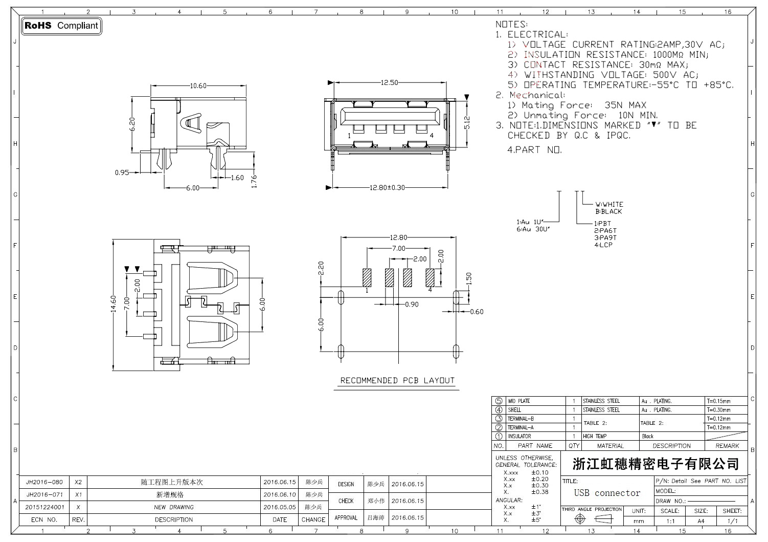 2.0USB插座技術參數: