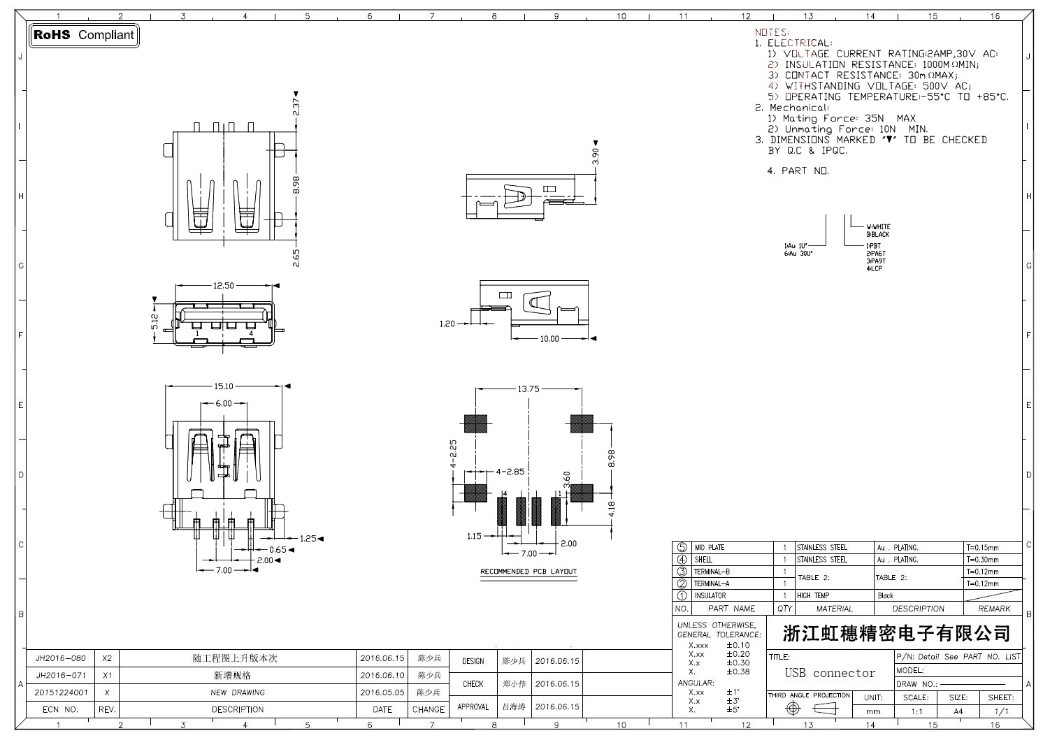 2.0USB插座技術參數: