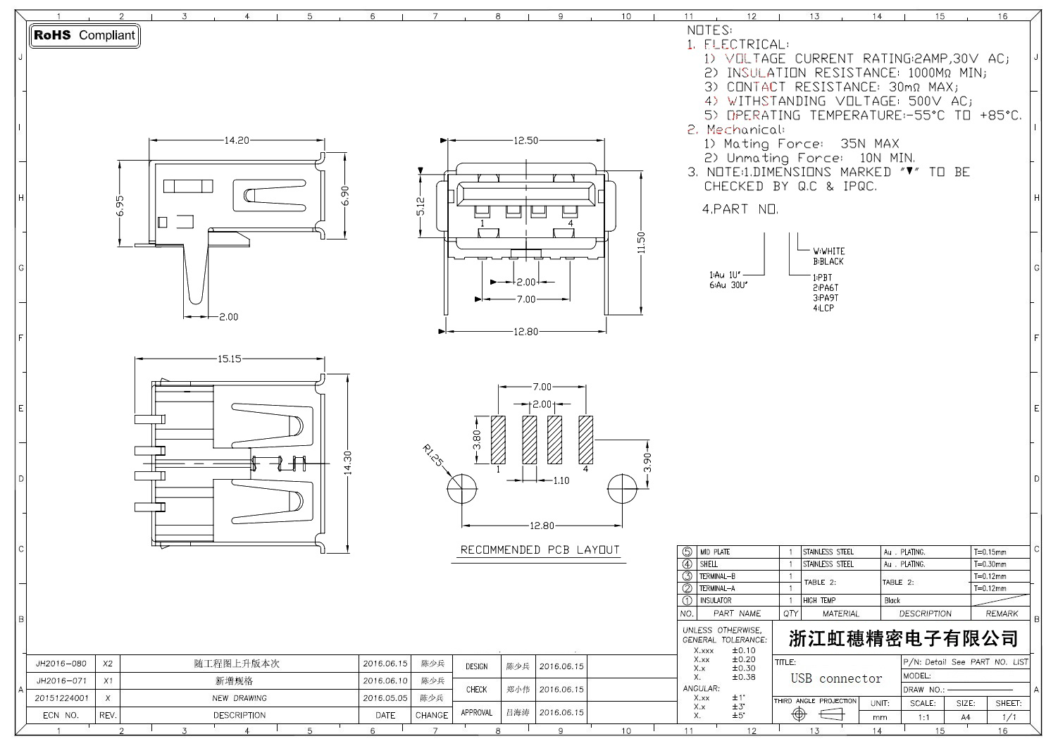 2.0USB插座技術參數: