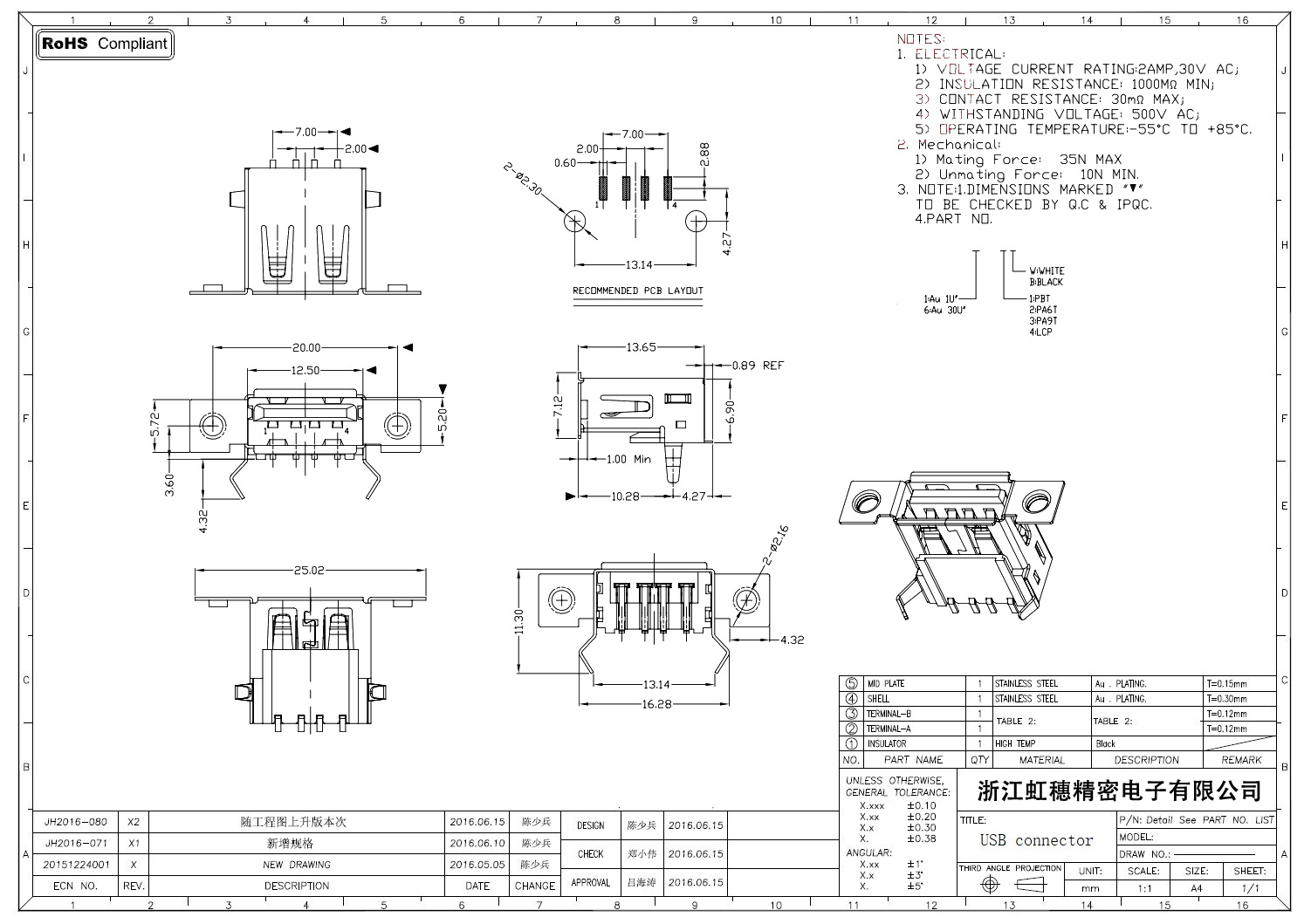 2.0USB插座技術參數: