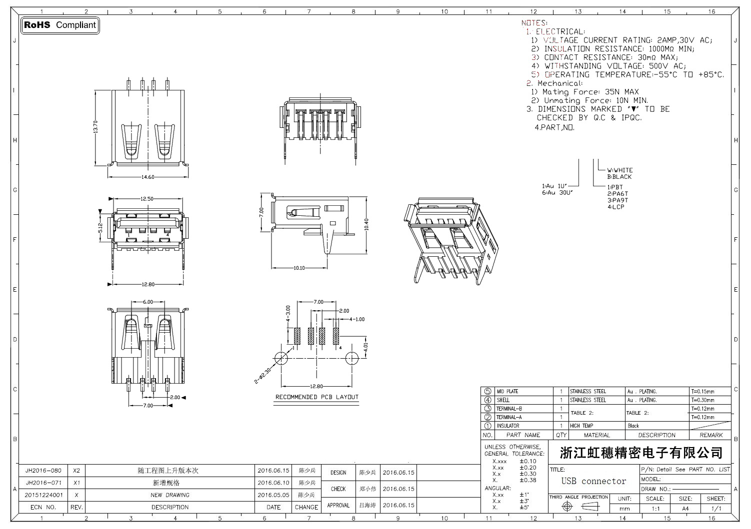 2.0USB插座技術參數: