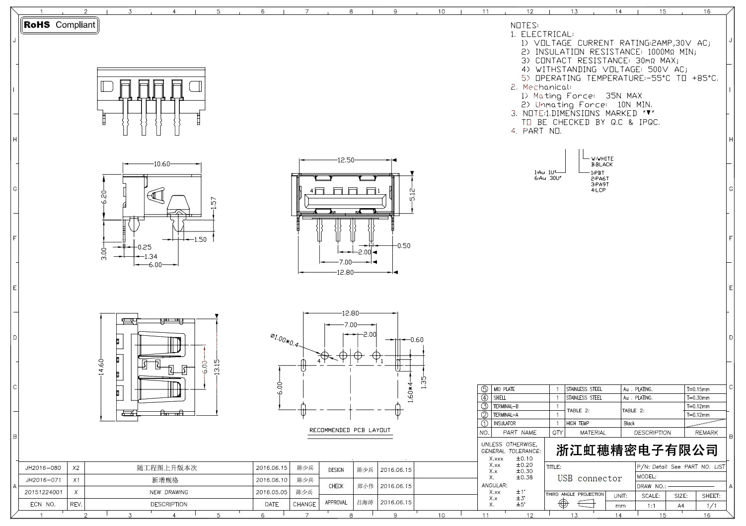 2.0USB插座技術參數: