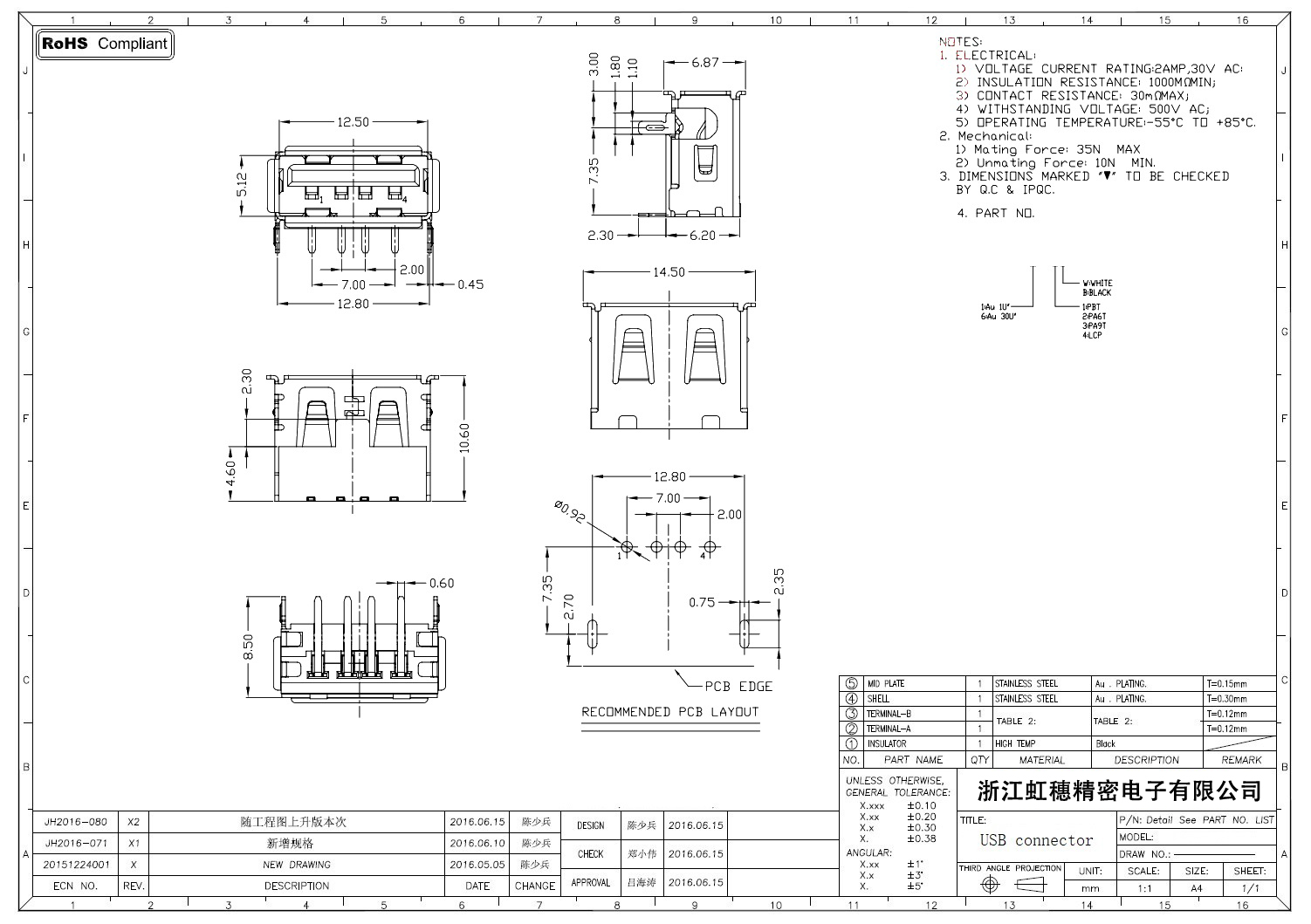 2.0USB插座技術(shù)參數(shù):