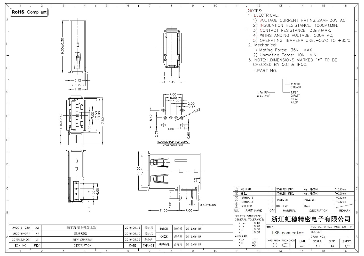 2.0USB插座技術參數: