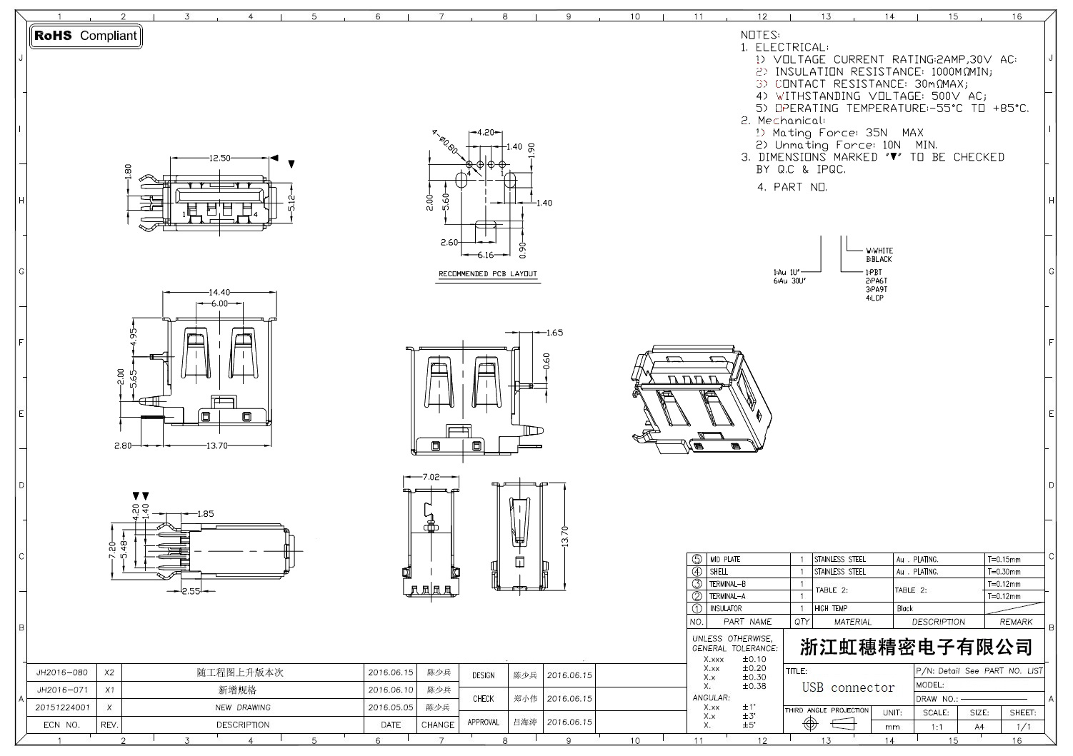 2.0USB插座技術參數:
