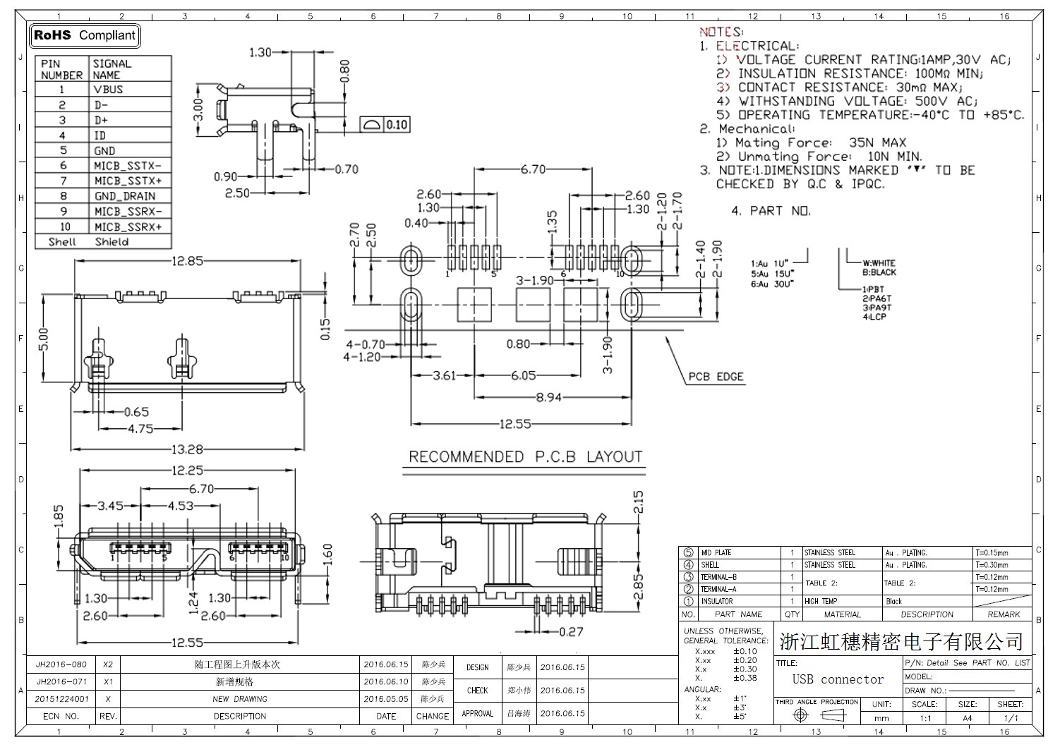 MICRO USB插座技術(shù)參數(shù):