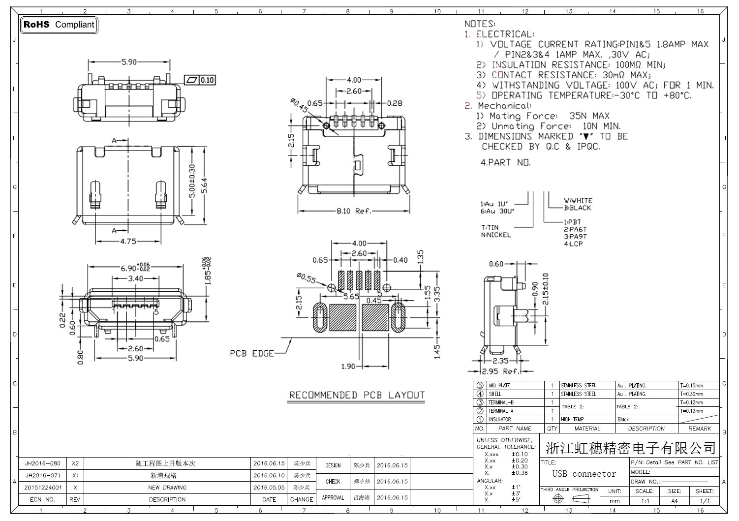 MICRO USB插座技術參數: